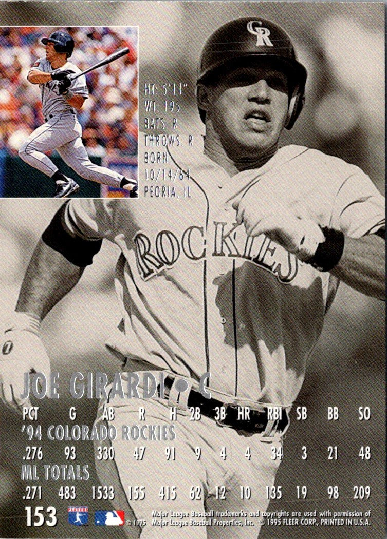 Joe Girardi's 1995 Ultra Gold Medallion is a must-have for any Colorado Rockies fan. This card showcases a classic image of Girardi, decked out in his Rockies uniform, with a vibrant blue background. The card is in excellent condition, and is a great addition to any sports collection. With a limited print run, this card is a great way to show support for the team, and to commemorate Girardi's time with the Rockies. A unique piece of Rockies memorabilia, this card is sure to be a cherished possession for years to come.