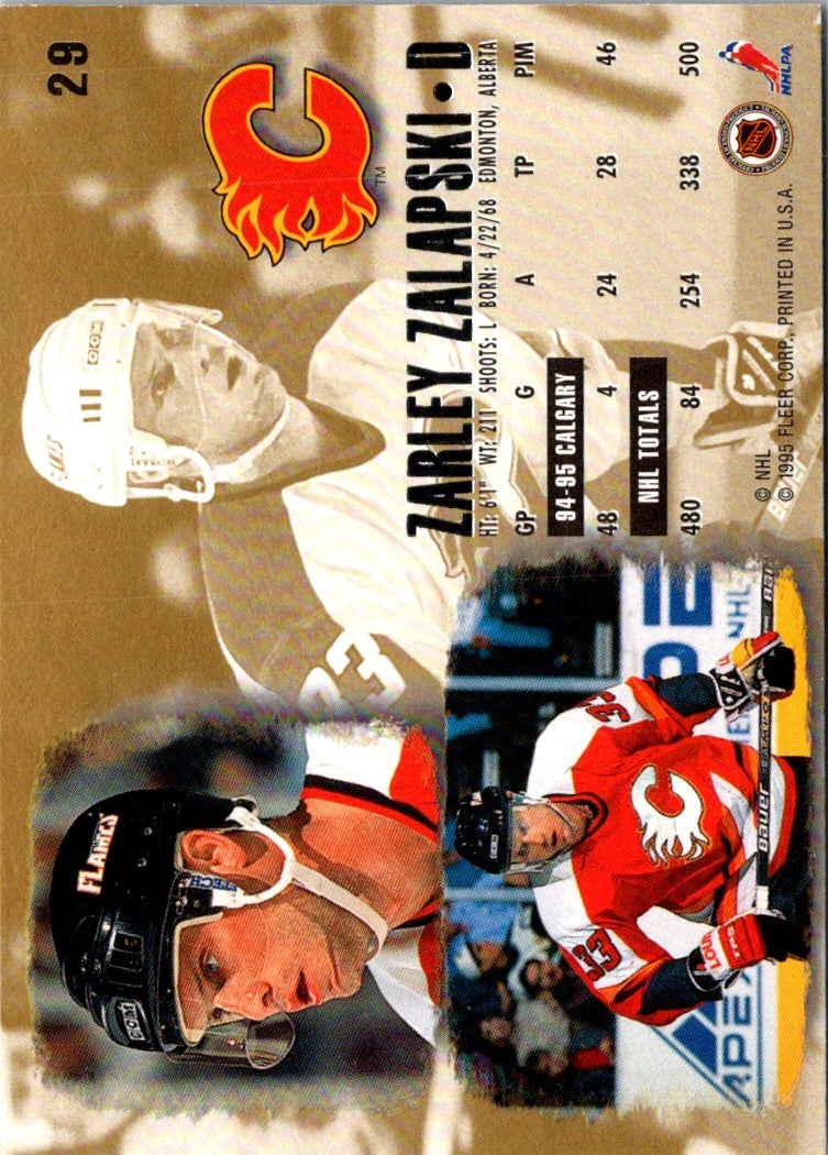 The 1995 Ultra Zarley Zalapski #29 Calgary Flames card is an essential piece for any serious hockey fan. This card commemorates one of the most successful players in Calgary Flames history. With a glossy finish and bold colors, this card stands out in any collection. The card features an action shot of Zarley Zalapski and is sure to be a great addition to your collection. Add this card to your collection today and honor one of the greatest players of the Calgary Flames.