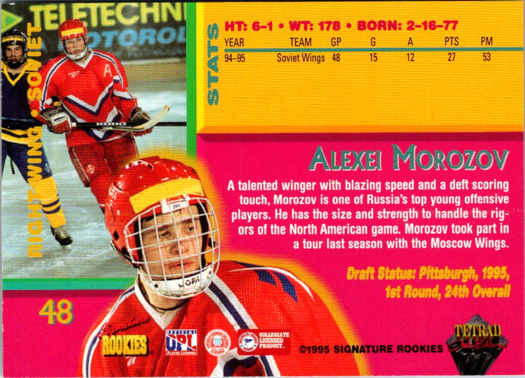 This 1995 Upper Deck Alexei Morozov #553Russia card is a must-have for any hockey fan! This card features a full-color action photo of Morozov in his Russian hockey uniform, and is a great way to commemorate the career of this talented player. The card is printed on high-quality stock and is sure to last for years to come. Add this card to your collection today and show your support for one of Russia's hockey greats!
