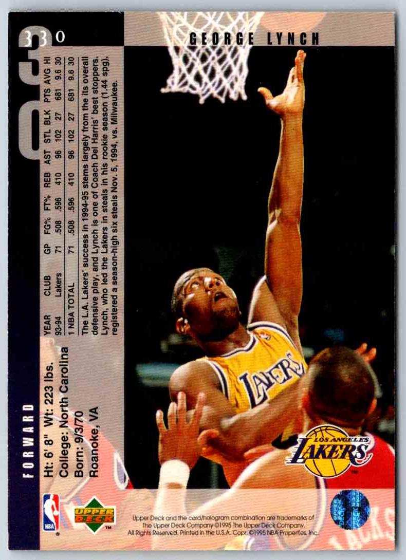 This 1995 Upper Deck George Lynch #330 trading card is a must-have for any collector! It features a dynamic image of the former NBA player mid-action on the court, with a bold and vibrant background that shows off the team's logo and colors. It's the perfect way to show your support for the team and to commemorate a legendary player. Add this card to your collection and honor the great George Lynch!