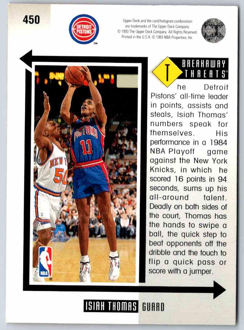 This 1995 Upper Deck Isiah Thomas card is a must-have for any basketball fan. Featuring a classic photo of Isiah Thomas in action, this card also features Thomas' stats, accomplishments and accolades in fine print. It is the perfect way to commemorate one of basketball's most iconic players and it is sure to be a great addition to any collection.