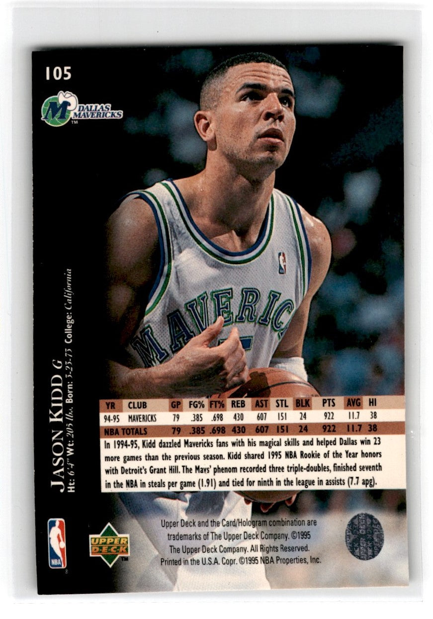 This 1995 Upper Deck Jason Kidd #105 Dallas Mavericks card is the perfect way to commemorate the career of a legendary basketball player. The card features a vibrant, full-color image of Kidd wearing his Mavericks jersey, ready to make a play. The card is in Near Mint/Mint condition and has a gold foil-embossed player name and team logo. It's a great addition to any basketball card collection and is sure to be a treasured keepsake for years to come.