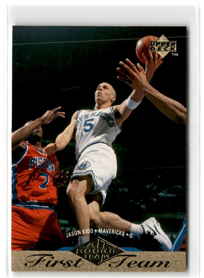 The 1995 Upper Deck Jason Kidd #155 Dallas Mavericks card perfectly captures the Hall of Famer in his signature playing style. The card features a vibrant color photo of Kidd in action and a detailed action shot on the back. This card is an essential for any Mavericks fan or basketball card collector. Add the 1995 Upper Deck Jason Kidd #155 Dallas Mavericks card to your collection today and show your support for one of the greatest players of all time!