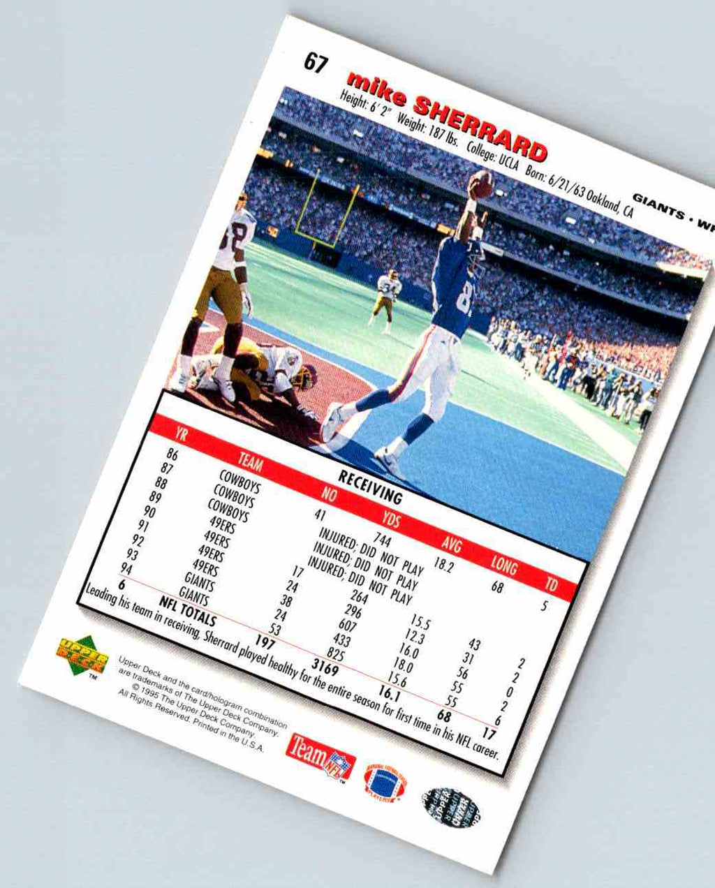 This 1995 Upper Deck Mike Sherrard #67 card is the perfect addition to any collector's portfolio. Featuring the iconic Dallas Cowboys wide receiver in full uniform, this card will bring back memories of Sherrard's record-breaking career. With an overall condition of NM/MT, this card is sure to be a prized possession in any collection. The card also features a glossy surface with sharp edges and corners, making it an excellent choice for any avid collector. Don't miss out on this timeless piece of sports memorabilia!