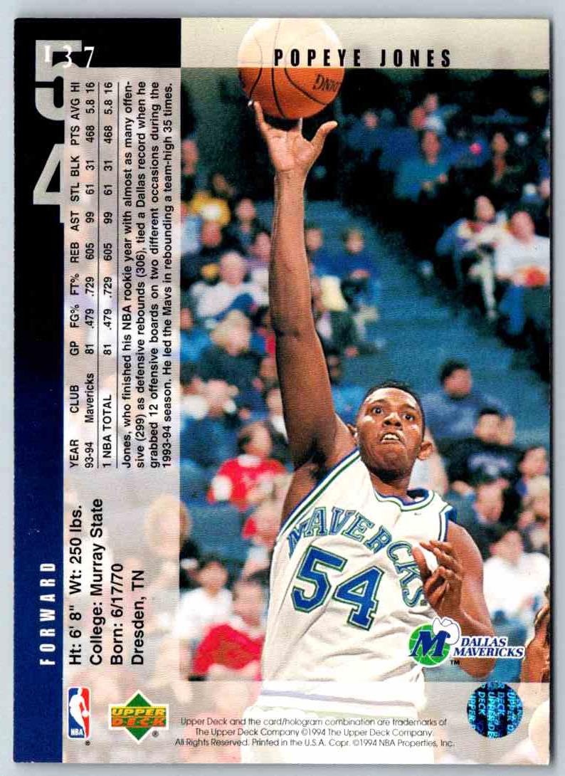 Introducing the 1995 Upper Deck Popeye Jones #137! This amazing collectible card is a must-have for any sports memorabilia enthusiast. Featuring Popeye Jones in full basketball uniform, it is sure to make an excellent addition to your collection. With a glossy finish and vibrant colors, this card has been designed to last and be enjoyed for years to come. Add this card to your collection today and relive the glory of Popeye Jones!