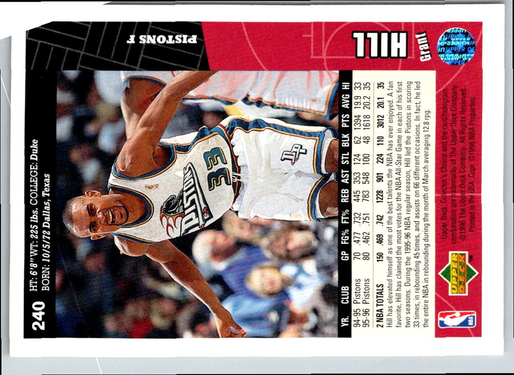 This 1996 Collector's Choice Grant Hill #240 Detroit Pistons edition is an essential for any basketball fan. Featuring the original team colors and a classic portrait of Grant Hill, this card is sure to bring back memories of the Pistons' 90s glory days. It also features a detailed description of Grant's stats, achievements and career highlights, making it a great addition to any collection. Whether you're a die-hard Pistons fan or just a casual basketball enthusiast, this card is sure to bring a smile to your face. So, don't wait - add this iconic card to your collection today!
