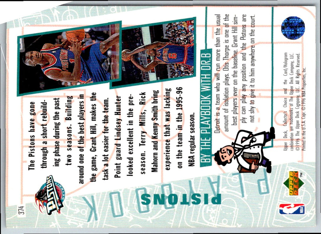 This 1996 Collector's Choice Grant Hill #374 Detroit Pistons card is a must-have for any NBA fan. The card features a great action shot of Hill in his Pistons uniform and is in near mint condition. Grant Hill was one of the most dynamic players of his era and was a seven-time All-Star. This card is a great addition to any basketball card collection and will be sure to grab the attention of any collector. Add this card to your collection today and own a piece of NBA history!