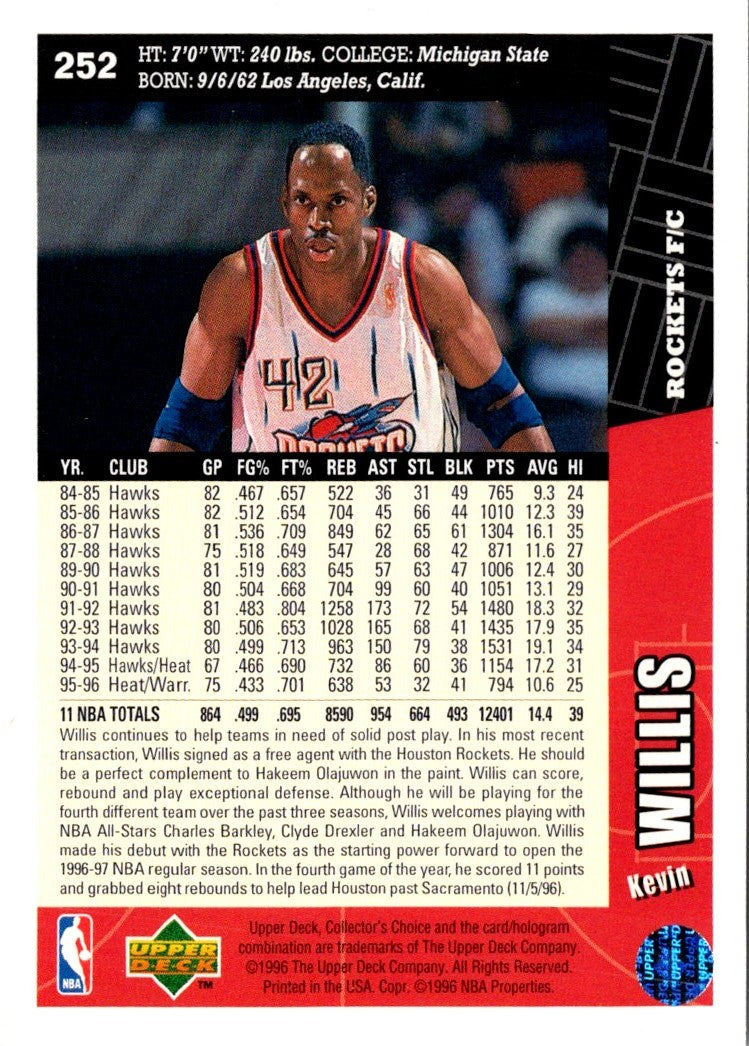 This 1996 Collector's Choice Kevin Willis #252 Houston Rockets card features a stunning image of the basketball star in action. The card is in near-mint condition, with only minor signs of wear. Perfect for any basketball fan or collector, this card is sure to be a treasured piece of memorabilia for years to come. Add this card to your collection today and show your support for one of the greatest players to ever play the game.