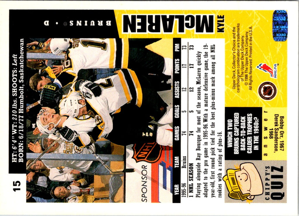 This 1996 Kyle McLaren #15 Boston Bruins card is the perfect addition to any hockey fan's collection. It features a full-color photograph of McLaren in his Bruins jersey, and the back of the card details his stats and biography. This is an original card from the 1996 Collector's Choice series, and is sure to be a great conversation starter at your next sports gathering. Collectors and hockey fans alike will appreciate this piece of hockey history and the chance to own a card of an integral part of the Bruins' 1996 team.