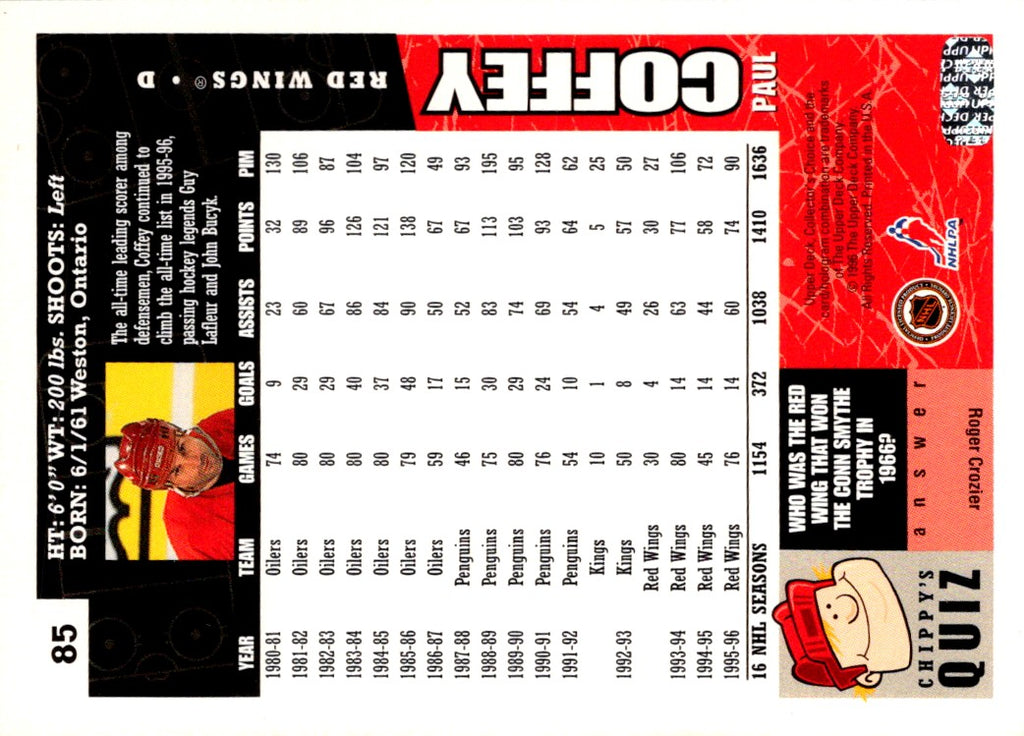 This 1996 Collector's Choice Paul Coffey #85 Detroit Red Wings card is perfect for any hockey fan. It features an image of one of the greatest defensemen to ever play the game, Paul Coffey, in his iconic Detroit Red Wings uniform. The card is printed on thick, glossy cardboard and is in perfect condition. It's a great addition to any collection and would make an excellent gift for any hockey fan.