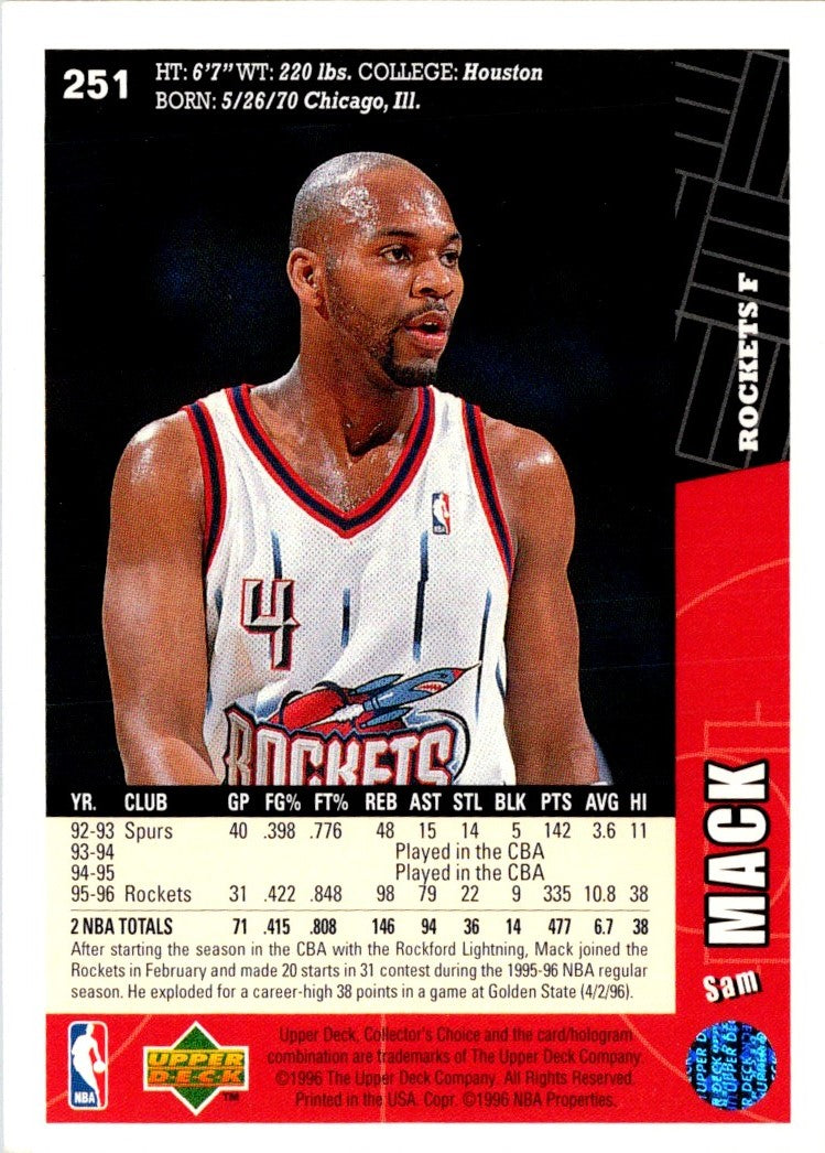 This 1996 Collector's Choice Sam Mack #251Houston Rockets card is sure to be a must for any collector. The card features an action shot of Mack in his Rockets uniform and is in great condition. The card is a great way to honor one of the most beloved Rockets of all time. The card is sure to be an instant classic, and a great way to add to any collection.