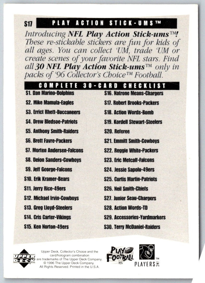 This 1996 Collector's Choice Stick-Ums Robert Brooks #S17 Green Bay Packers card is perfect for any collector of nostalgic sports memorabilia. Featuring a full-color photo of the star player, this card is sure to be a hit with any fan of the team or of Robert Brooks himself. The card is printed on a durable, high-quality stock that is sure to last for years to come and will make a great addition to any fan's collection. Celebrate the career of one of the greatest players in the history of the Green Bay Packers with this amazing card today!