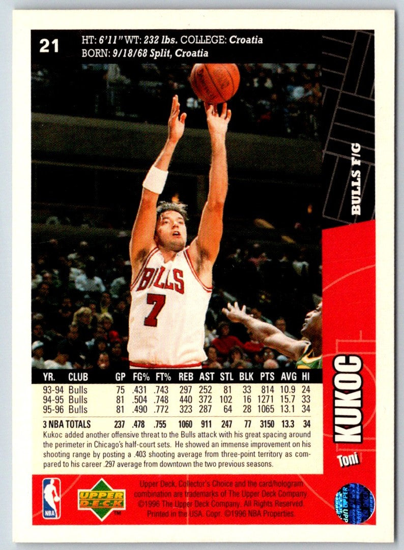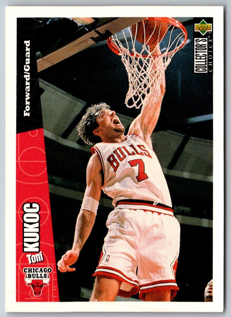 This 1996 Collector's Choice Toni Kukoc #21Chicago Bulls card is a must-have for any Bulls fan or basketball card collector! With a phenomenal action shot of the 6-time NBA All-Star, his signature look of determination and intensity will be sure to add an extra edge to your collection. This card is in pristine condition, with crisp colors and a glossy finish. It comes with a protective sleeve, making it a long-lasting collectible that will stand the test of time. Add this card to your collection today and show your support for one of the greatest Bulls of all time!