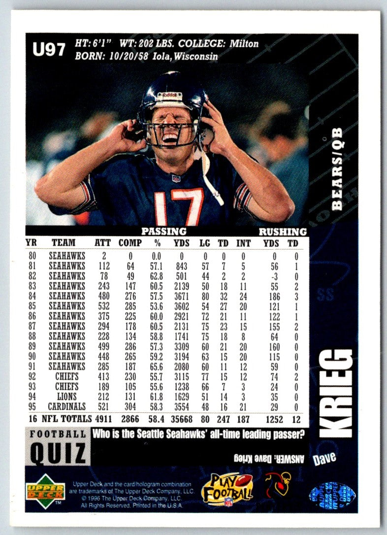 This 1996 Collector's Choice Update Dave Krieg card is an essential piece for any Chicago Bears fan! Featuring a sharp, vibrant image of Krieg in his Bears uniform, this card is sure to be a hit with its bold colors and detailing. The back of the card shows Krieg's career stats and achievements, a great way to commemorate his time with the Bears. Add this card to your collection today and celebrate the greatness of Dave Krieg!