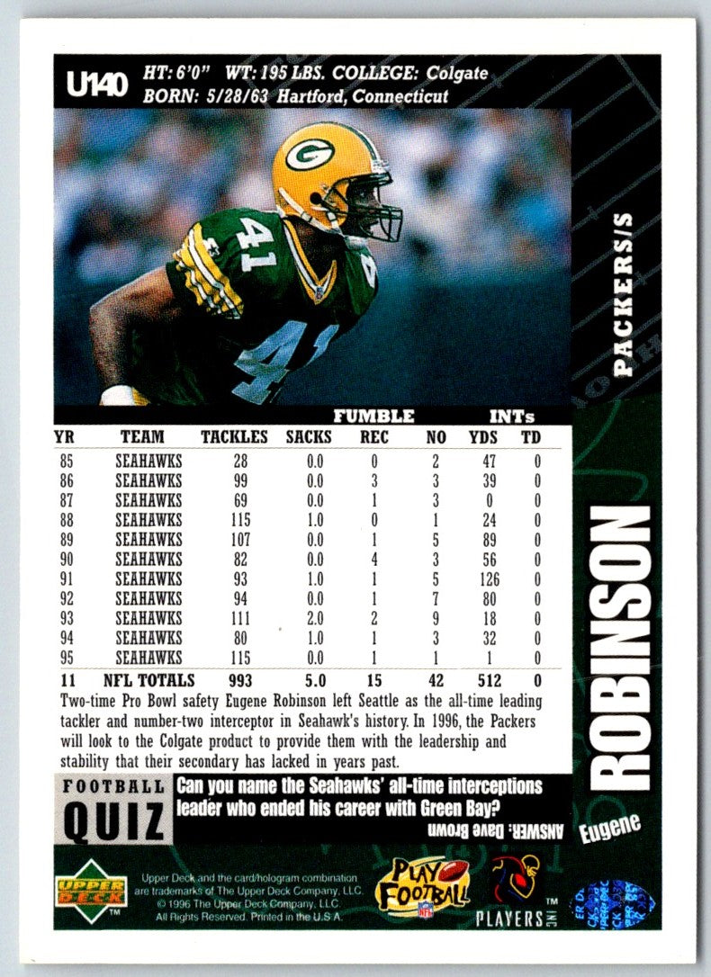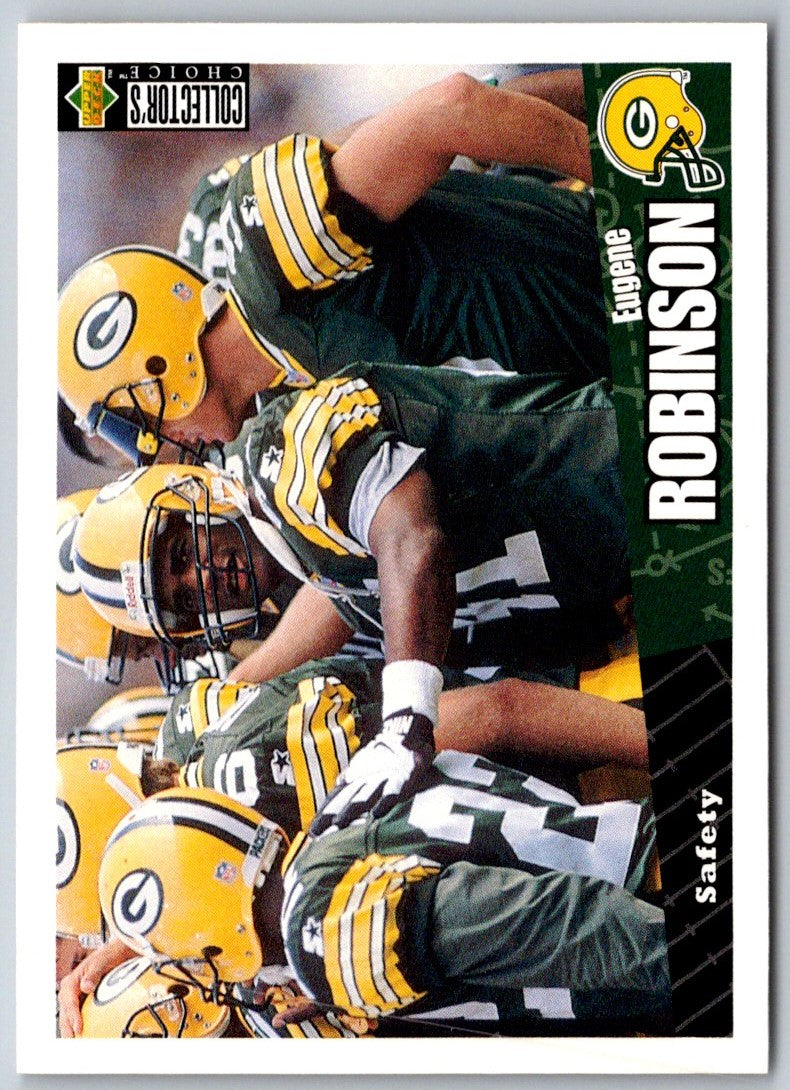 This 1996 Collector's Choice Update Eugene Robinson #U140 is a must have for any Green Bay Packers fan! This card features a classic picture of Robinson in his Packers uniform and is in excellent condition. It is the perfect way to show your support for the Packers and honor Robinson's great career. Add this card to your collection today and show your pride in the Green Bay Packers!