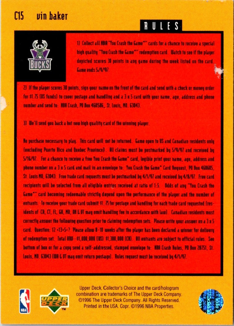 Description: 1996 Collector's Choice You Crash the Game Scoring Vin Baker #C15A