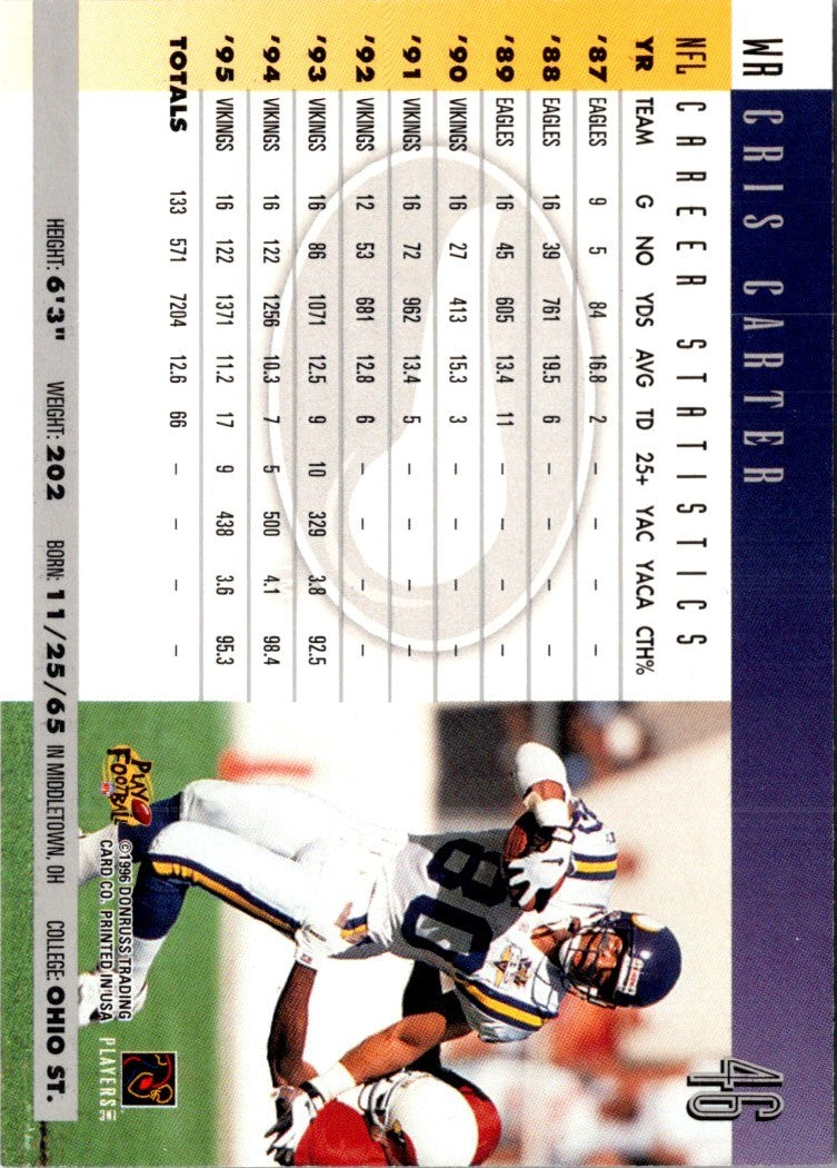 This 1996 Donruss Cris Carter #46 card is a must-have for any Minnesota Vikings fan! Cris Carter, a Hall of Fame wide receiver, was a key part of the Vikings' success in the 1990s. This card is in near-mint condition and features a vibrant photo of Carter in his Vikings uniform, ready to make another big play. Don't miss out on this opportunity to own a piece of Vikings history!