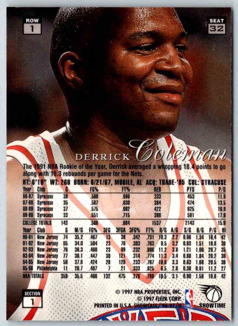 The 1996 Flair Derrick Coleman #32 features a classic card design with a glossy surface, classic photos and detailed statistics. This card is a must-have for any basketball fan or collector. The vivid colors and intricate design showcase the athletic ability of one of the most influential players of the 1990s. His impressive career statistics are a testament to his importance to the game of basketball. Whether you're looking to complete a set or just add a unique piece to your collection, this card is the perfect choice.