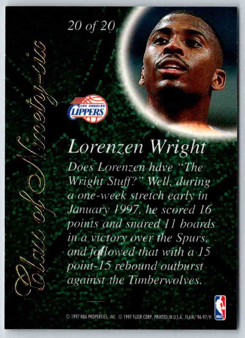 This 1996 Flair Lorenzen Wright #20 OF 20 card is a classic piece of memorabilia for basketball fans. Featuring a sharp, high-quality photo of Wright in his Atlanta Hawks jersey, the card captures a moment in time, as the star power forward was a prominent figure in the NBA during the mid-90s. The card is printed on premium glossy stock, perfect for framing and display. It is a must-have for any collector of basketball cards.