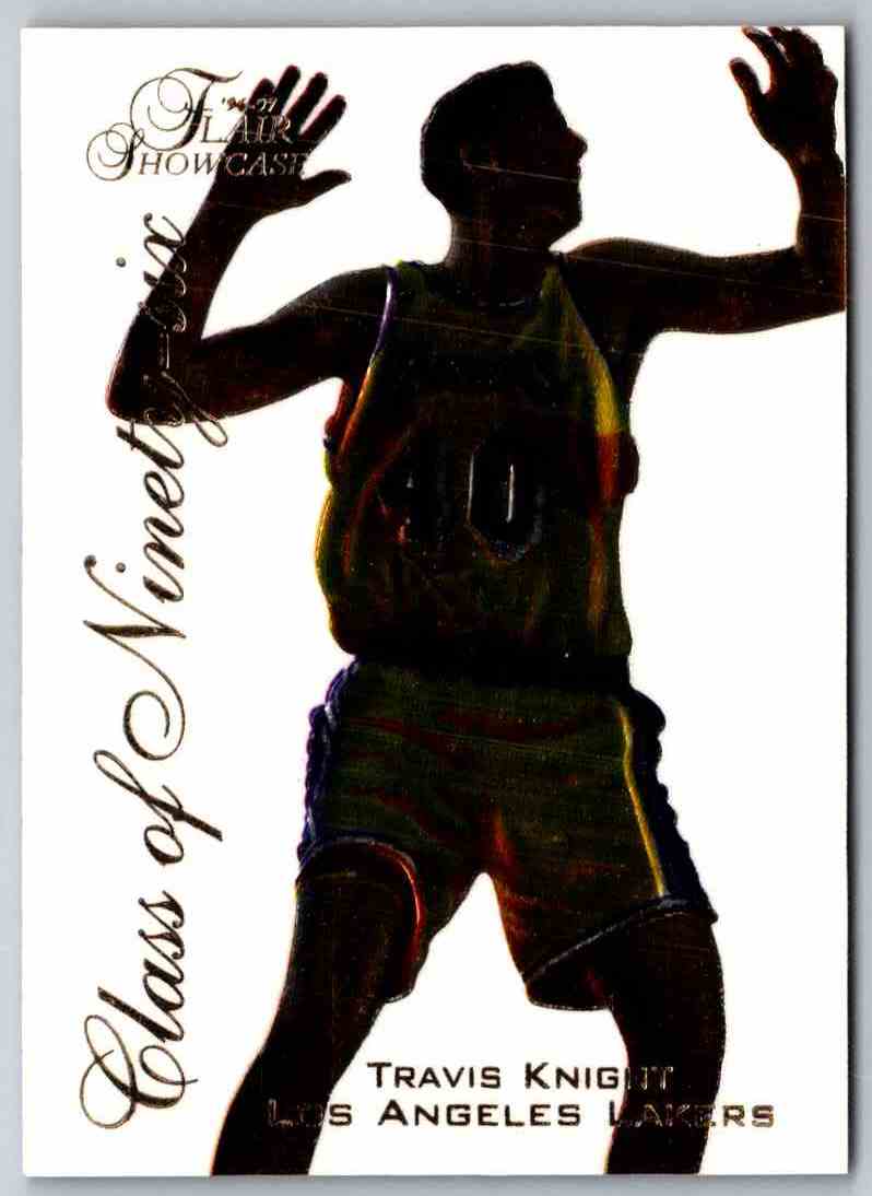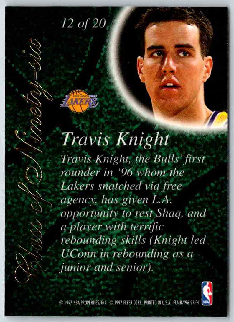 This collectible basketball card features 1996 Flair Travis Knight #12 OF 20. This card showcases a classic black and white image of Knight in action on the court. It is a great addition to any basketball card collection, and provides an opportunity to capture a moment of basketball history. The card is printed on high-quality cardstock and features a glossy finish to preserve its condition. The back of the card features Knight's career stats and a brief biography. Don't miss your chance to add this unique card to your collection and show your support for a basketball legend.