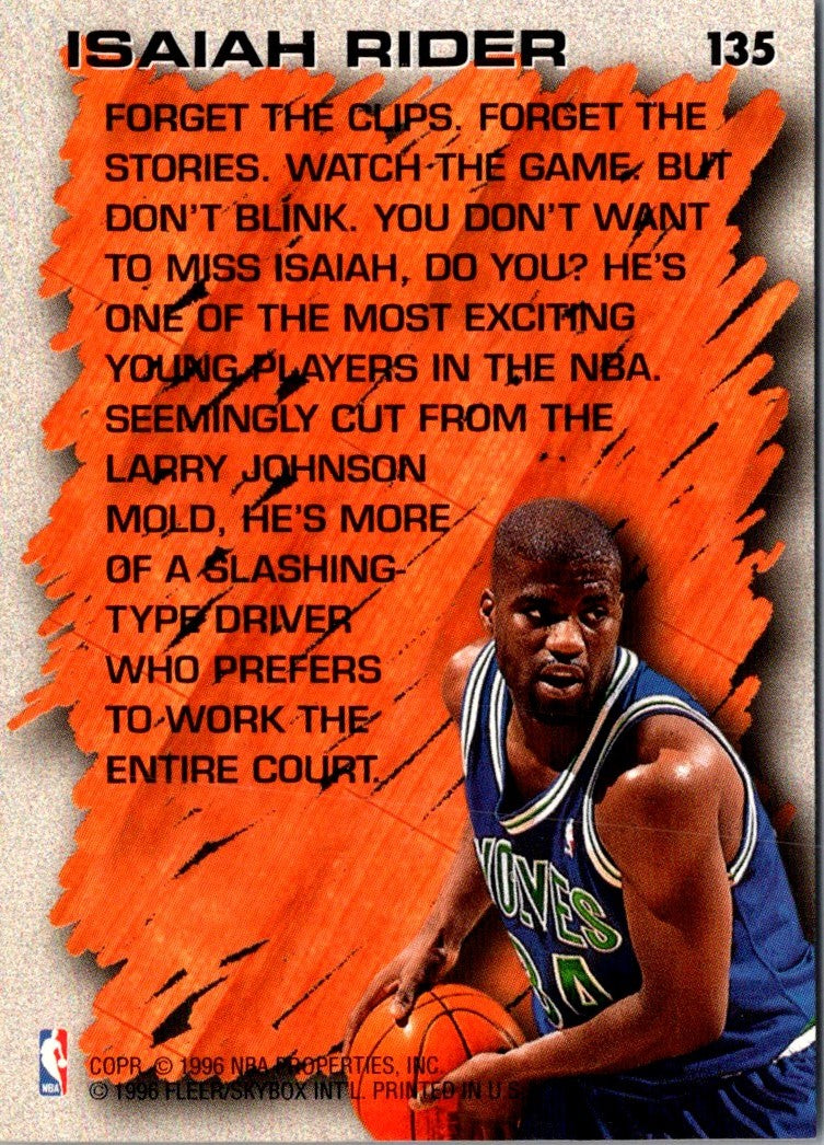 This 1996 Fleer Isaiah Rider #135Minnesota Timberwolves card is a must-have for any Timberwolves fan or basketball card collector! Featuring a classic portrait of Rider in his Timberwolves jersey, this card captures the energy and excitement of the '96 season. It's an excellent addition to any collection! Rider's stats from the season are printed on the back, making it a great collectible piece to commemorate his first season in Minnesota. Get your hands on this piece of Timberwolves history today!
