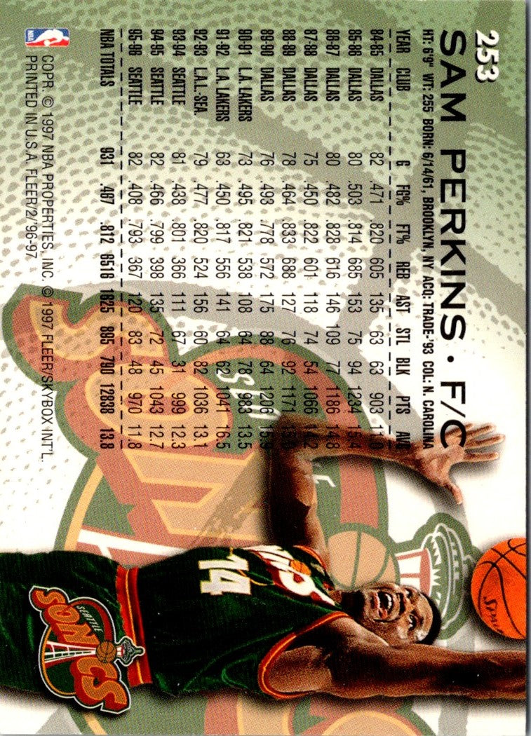 This 1996 Fleer Sam Perkins #253 Seattle SuperSonics trading card is the perfect addition to any basketball card collection. Sam Perkins was a key member of the SuperSonics for over four years and was a three-time NBA All-Star. Show your appreciation for a true SuperSonic legend with this card, which features a vibrant full-body photograph of Perkins in his signature green and yellow uniform. The card's reverse side includes his career statistics, making it a great way to commemorate the player's impressive career. Add this card to your collection today and never forget the legacy of Sam Perkins.