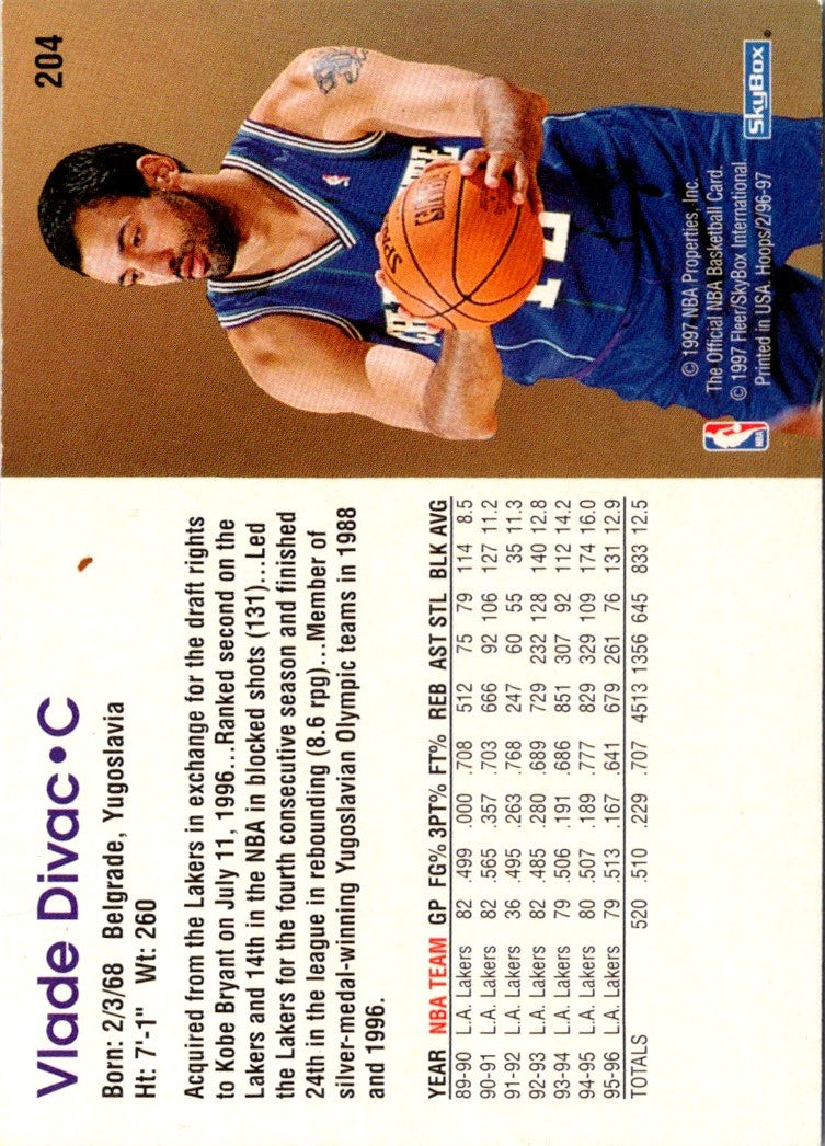 The 1996 Hoops Vlade Divac #204 Charlotte Hornets trading card is a collector's item for any die-hard Hornets fan. This card features Divac, the all-time Hornets leader in career rebounds and assists, in his iconic teal and purple Hornets uniform. The card is in great condition, with a glossy finish and sharp corners. It's a must-have in any Charlotte Hornets fan's collection!