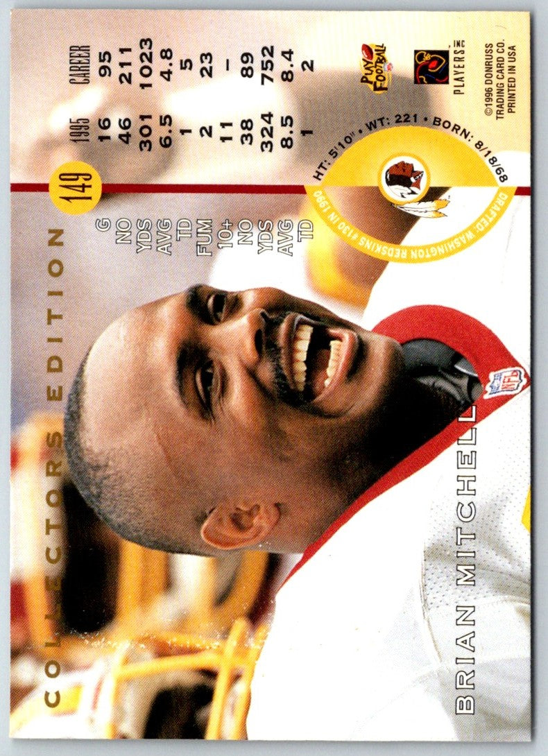 This 1996 Leaf Brian Mitchell card #149 is a must-have for any Washington Redskins fan! Featuring a classic action shot of Mitchell in his Redskins jersey, this card is great for fans of the legendary quarterback. The card has a glossy finish and vibrant colors, making it a great collectible or display item. With a detailed biographical profile of Mitchell on the back, this card is a great way to honor the football star. Add this card to your collection today!