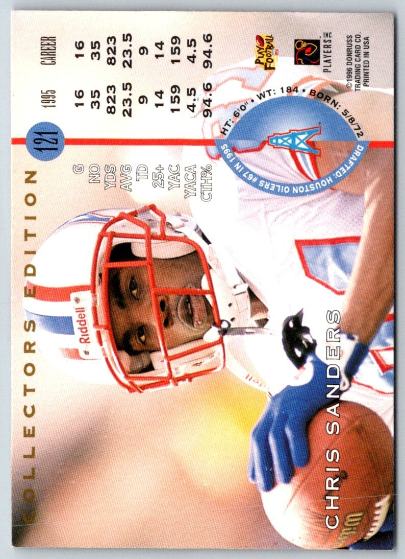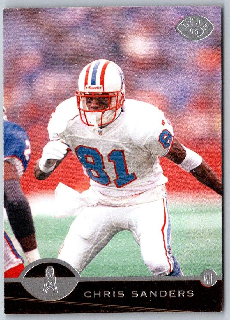 This 1996 Leaf Collector's Edition Chris Sanders card commemorates the Houston Oilers' star running back with a vivid full-color image of Sanders on the field. The card is in near mint condition, and it's a must-have for any Oilers fan or football card collector. The card is a great way to honor one of the most talented players in the game and add some nostalgic flair to your memorabilia collection. Get yours today!