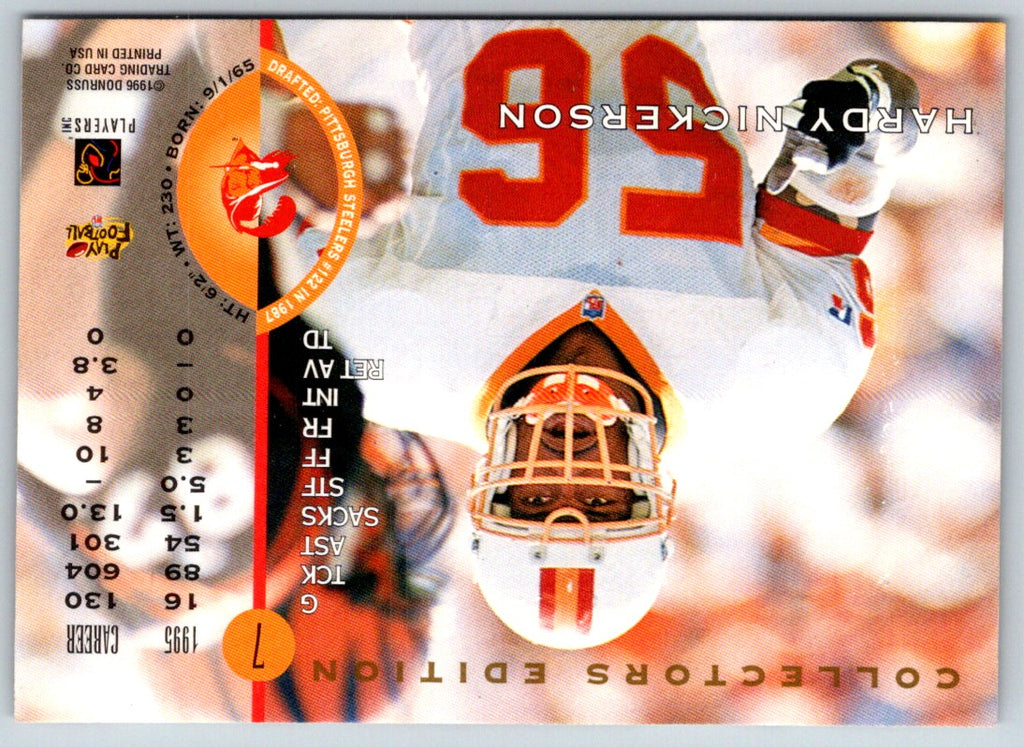 This 1996 Leaf Collector's Edition Hardy Nickerson #7 Tampa Bay Buccaneers card is a must-have for any Buccaneers fan. Featuring a vivid, full-color image of Nickerson in his classic Buccaneers uniform, this card serves as a tribute to the hard-hitting linebacker's stellar career. It is a great way to honor one of the most beloved players in franchise history. This card is in near-mint condition, making it an ideal choice for any collector. Add this piece to your collection today and celebrate the legacy of Hardy Nickerson!