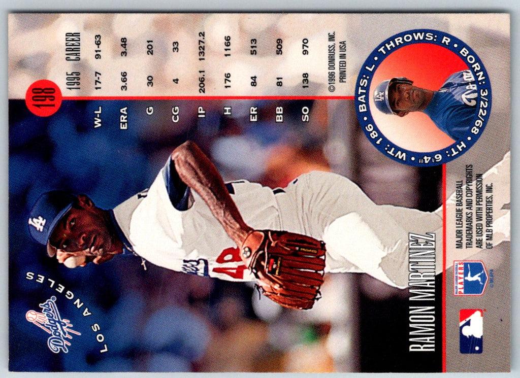 This 1996 Leaf Ramon Martinez #198 card is an essential piece for any serious Los Angeles Dodgers fan. Featuring a vibrant image of Martinez in full batting stance, the card captures the energy and intensity of the game. It is a reminder of the player's legendary career, and is sure to become a treasured item in any collection. Highly collectible and sure to please, this card is a must-have for any Dodgers fan.