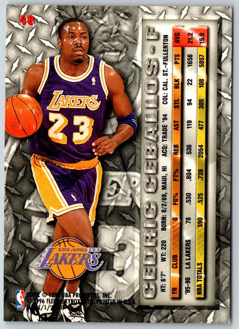 This 1996 Metal Cedric Ceballos #48 Los Angeles Lakers trading card is a must-have for any Lakers fan. The card features a classic image of Cedric Ceballos in his signature Lakers jersey and is sure to add a pop of Lakers pride to any collection. With high-quality metal construction and a glossy finish, this card is sure to stand out amongst the rest. Add this iconic card to your collection today and show off your Lakers fandom!