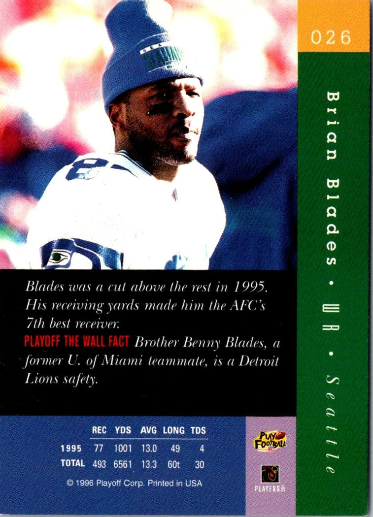 This 1996 Playoff Absolute Brian Blades #26 Seattle Seahawks card is the perfect way to celebrate one of the greatest Seahawks of all time! Featuring a crisp, clear image of Blades on the front, this card is sure to be a hit with any Seahawks fan. The back of the card features stats and a brief biography of this legendary athlete. Add this beautiful piece to your collection today and remember one of the best to ever play for the Seattle Seahawks!