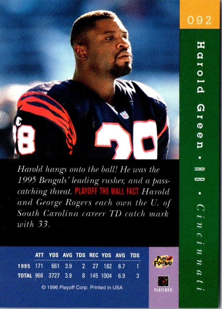 This 1996 Playoff Absolute card of Harold Green is an amazing collector's item. Green was a four-time Pro Bowler for the Cincinnati Bengals and a key member of the team's offense. This card features an action shot of Green in his Bengals uniform and showcases his impressive skills. The card also features a colorful Bengals logo and team colors. A must-have item for any Bengals fan or card collector.