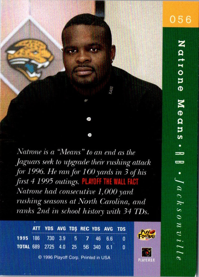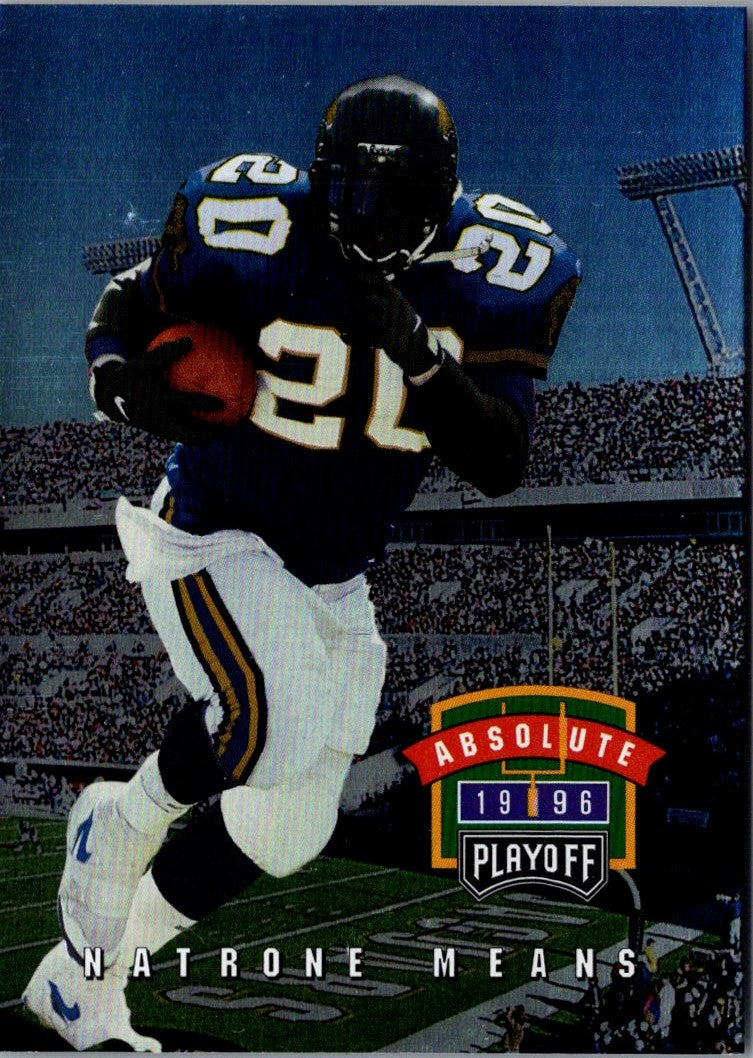 This 1996 Playoff Absolute Natrone Means #56 Jacksonville Jaguars collectible is a must-have for any football fan. This card features a vibrant full-color photo of Natrone Means, one of the most prominent running backs of the 1990s. The card is in mint condition, perfect to add to any collection. The back of the card provides information about Means' career achievements. This card is a great reminder of the great career Means had, and it's a great conversation piece for any sports fan. Get your hands on this collectible today!