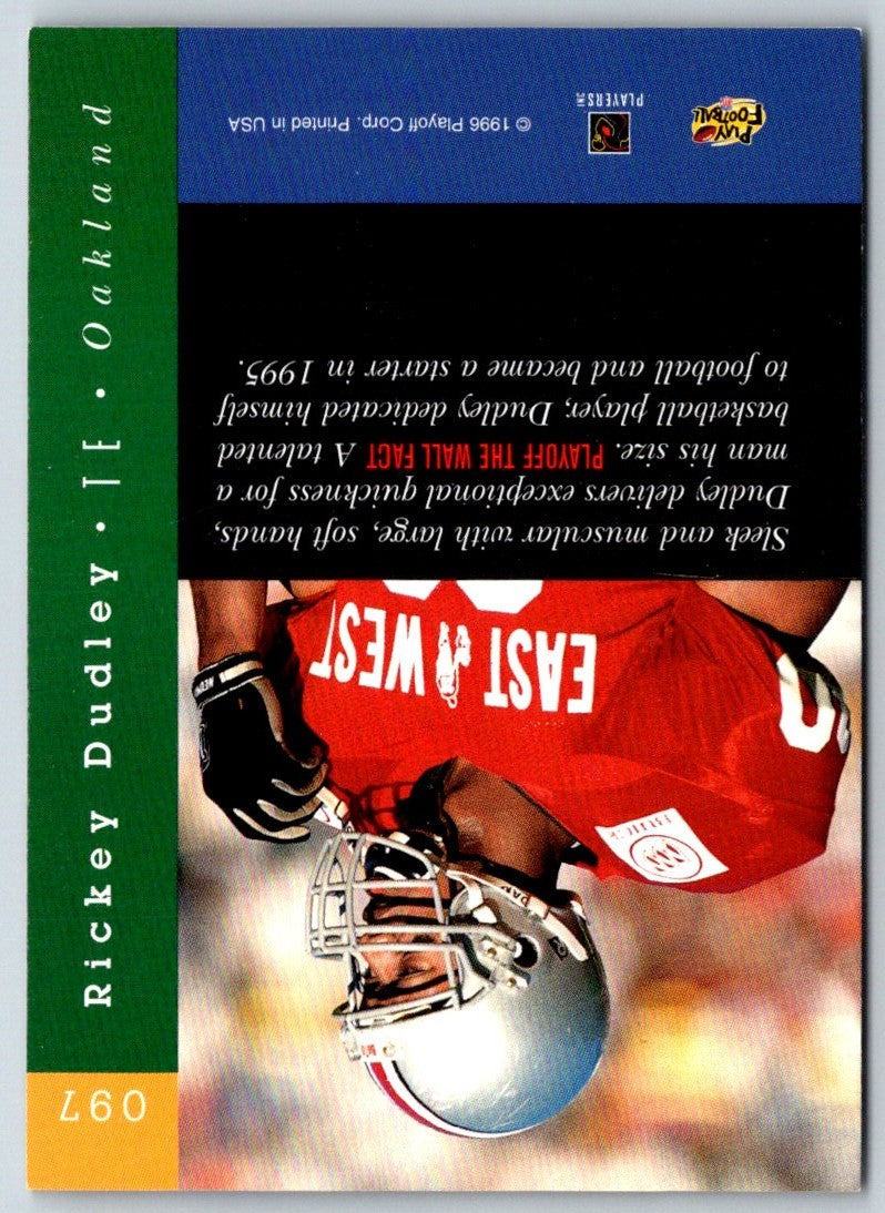 This 1996 Playoff Absolute Rickey Dudley #97 Oakland Raiders card features the star tight end on a background of navy, silver, and black. It captures Dudley in a signature pose, wearing his Raiders jersey and helmet, and is embossed with the team’s logo. The card is printed on high-quality cardstock, with a glossy finish. It is perfect for any Oakland Raiders fan who wants to add to their collections.
