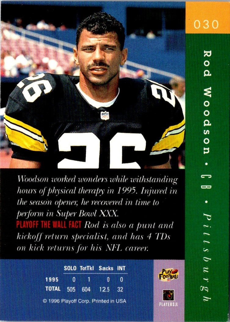 This 1996 Playoff Absolute Rod Woodson #30 Pittsburgh Steelers card is a must-have for any Steelers fan or collector. This card features a full-color action shot of Woodson in his classic Steelers uniform. The card's glossy finish and vibrant colors will make it a standout in any collection. Plus, the card is in great condition, ensuring it's a great investment. The card is perfect for any fan looking to honor the Pro Football Hall of Fame cornerback, and it's a great way to show your Steelers pride.