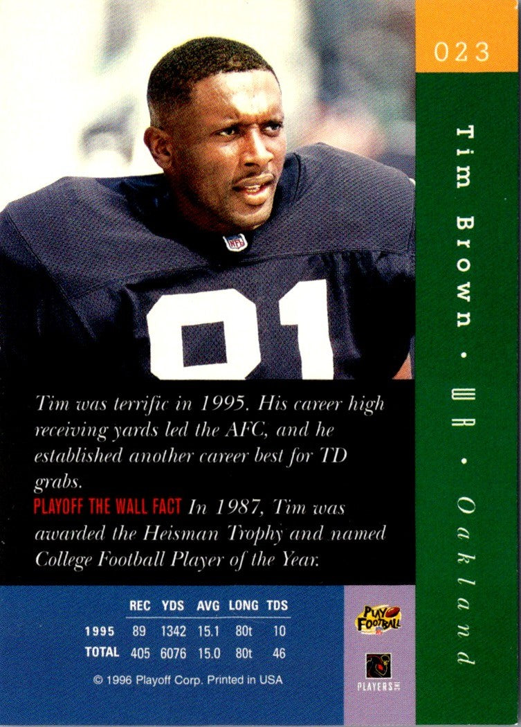 This 1996 Playoff Absolute Tim Brown #23 Oakland Raiders card carries an air of nostalgia and a great way to honor one of the all-time greats of the game. Tim Brown is a Hall of Famer and this card is a must-have for any Raiders fan. It is from the Absolute set and features a great action shot of Brown in his classic silver and black. Add this card to your collection today and show your love for the Raiders and the legendary Tim Brown!