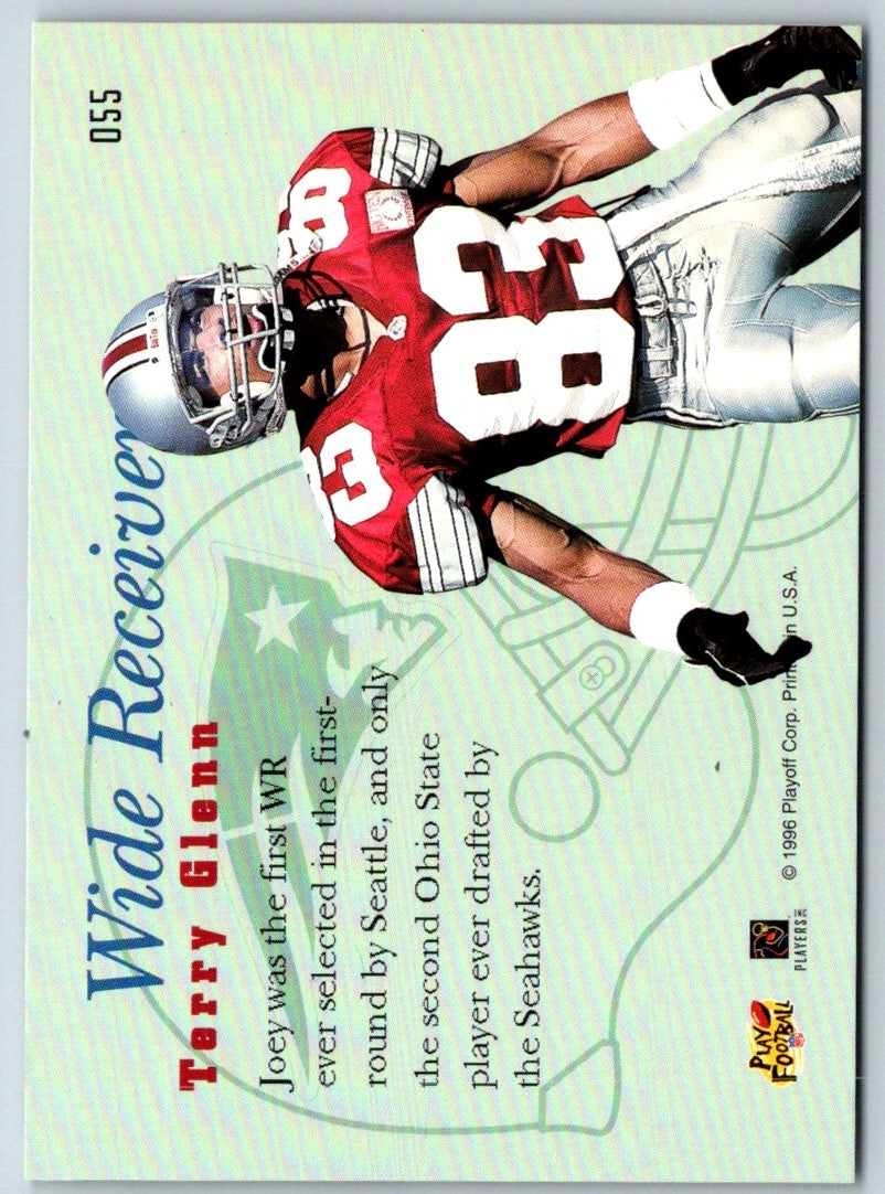 This 1996 Playoff Prime Terry Glenn #55 Seattle Seahawks card is the perfect addition to any collection! It features a dynamic action shot of the young, talented wide receiver in his Seahawks uniform with bright, bold colors that will really stand out. The detailed design on the back includes stats, team logos, and a bio of Glenn's career highlights. Add this card to your collection today and relive the excitement of the 1996 season!