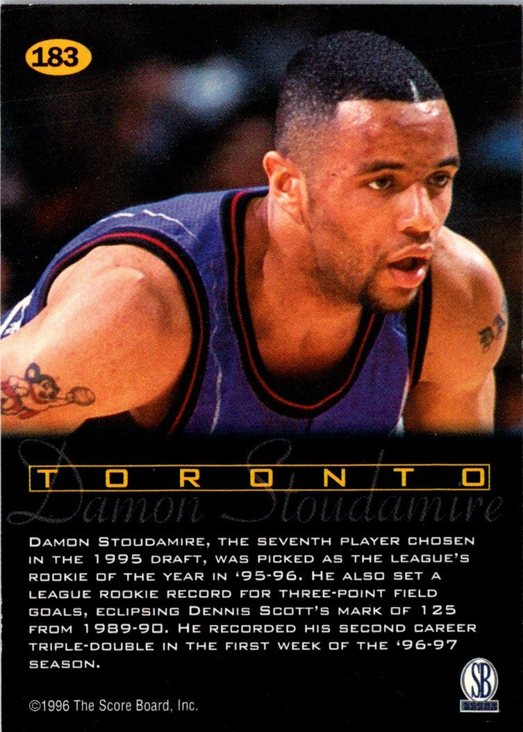 This 1996 Score Board Damon Stoudamire #49 Toronto Raptors card is the perfect addition to any Raptors fan's collection. Featuring bold action photography of Stoudamire in his classic Raptors jersey, this card is sure to be a cherished piece of memorabilia. With a detailed design, this card is sure to make any collector smile. With a limited print run, this card is sure to become a valuable piece of Toronto Raptors history. Celebrate the greatness of Stoudamire with this unique collectible. Add it to your collection today!