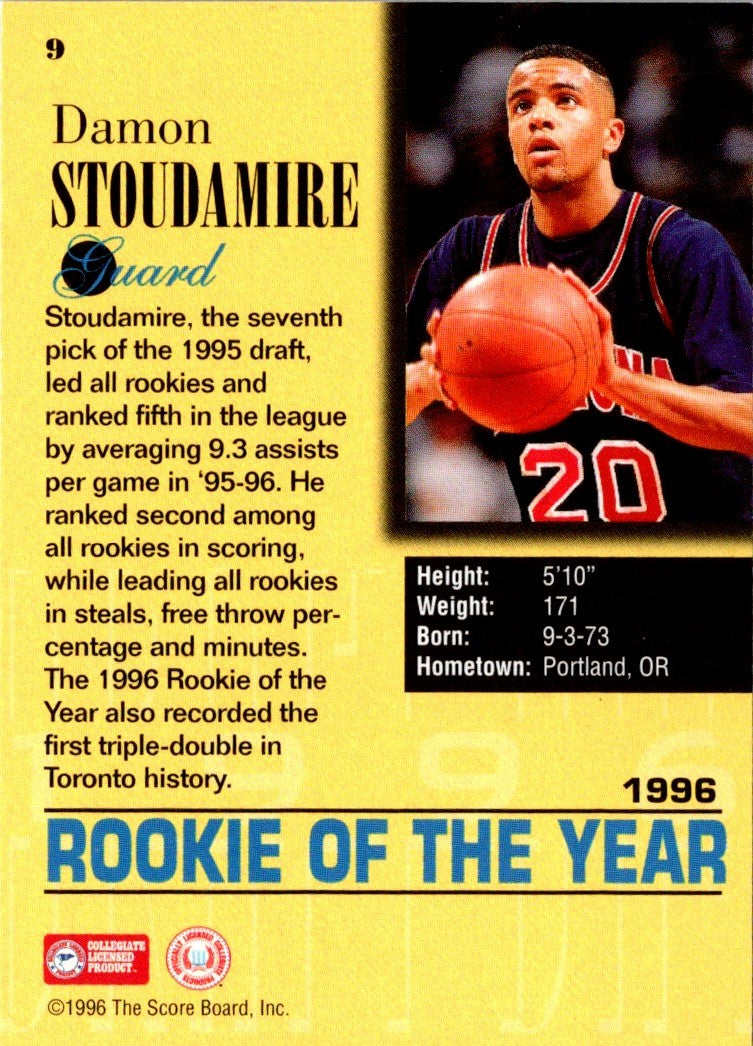 This 1996 Score Board Draft Day Damon Stoudamire #9 Toronto Raptors card is an essential piece of memorabilia for any basketball fan. Featuring an image of Stoudamire in his Raptors uniform, the card is a great way to celebrate the success of one of the NBA's most prolific point guards. This card captures the moment when Stoudamire was drafted to the Raptors in 1996, and makes a great addition to any collection. Show your support for the Raptors and Stoudamire with this timeless collectible!