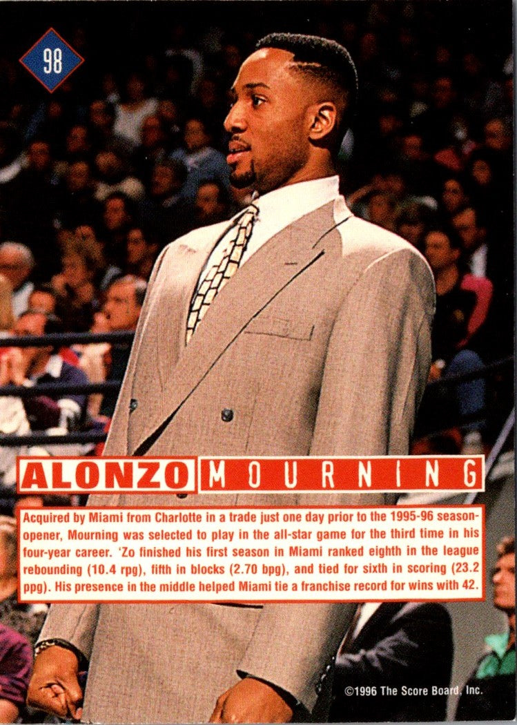 This 1996 Score Board Rookies Alonzo Mourning #98 Miami Heat card captures the Hall of Fame center in his prime! Depicted in his Heat uniform, Mourning looks ready to dominate the competition. Featuring stunning photographic detail, this card will look great in any collection. Add this iconic card to your collection of basketball memorabilia today!