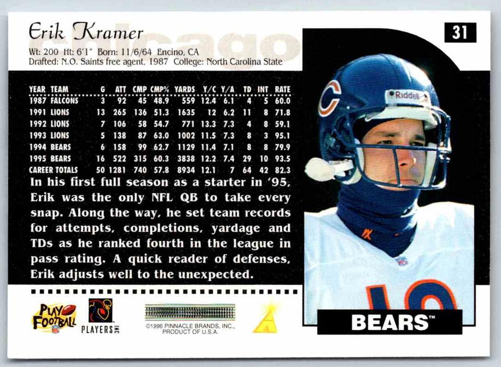 This 1996 Score Erik Kramer card #31 features an action shot of the quarterback in his Chicago Bears uniform. Kramer was a strong quarterback for the Bears, leading the team to the playoffs in 1994-1995. He threw for 3,838 yards in 1995 and was named to the Pro Bowl. This card is the perfect addition to any Chicago Bears or Erik Kramer fan collection.