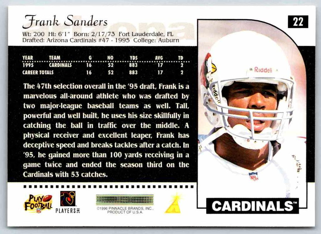 This 1996 Score Frank Sanders #22 card is a must-have for any NFL fan. It features a great photo of the former wide receiver, who played for both the Atlanta Falcons and the Arizona Cardinals during his career. The back of the card has Sanders' detailed stats and accomplishments, along with a brief bio. This is a valuable collectible item that will be a great addition to any fan's collection. Don't miss out on this classic card!