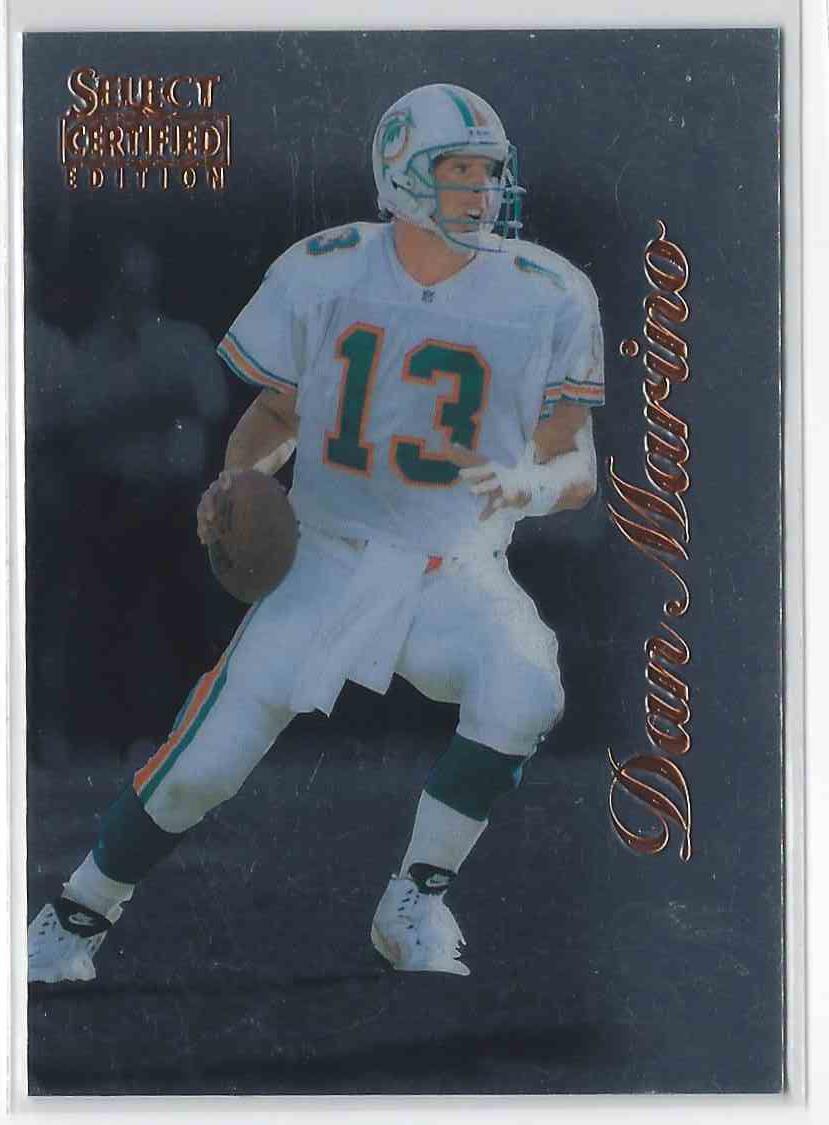 This 1996 Select Dan Marino #55 trading card is a great addition to any fan's collection! This card features a full-color image of Dan Marino as a Miami Dolphin, with team and league logos in the background. The card also features Marino's career stats and a brief biography on the back. This card is perfect for any collector looking to honor the legendary quarterback's career. Add this card to your collection today and show your love for the Dolphins and Dan Marino!