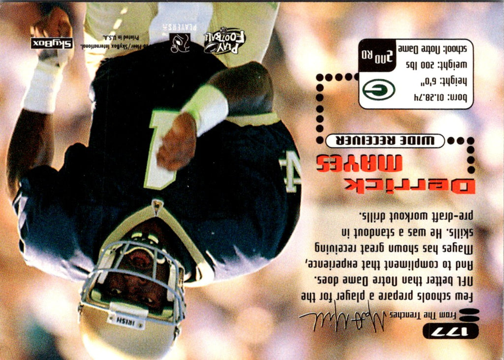 The 1996 SkyBox Impact Derrick Mayes #177 Green Bay Packers card is an essential piece for any Packers fan's collection. Featuring a photo of Mayes in action, this card combines with sharp detailing and vivid colors to provide a stunning display. This card is perfect for any collection, from the casual fan to the expert collector. Get your hands on the 1996 SkyBox Impact Derrick Mayes #177 Green Bay Packers card to commemorate one of the team's all-time greats.