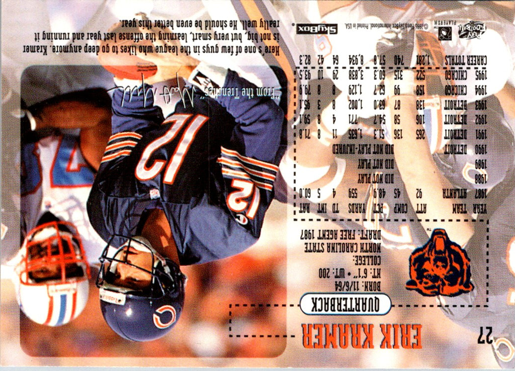 This 1996 SkyBox Impact Erik Kramer #27Chicago Bears card is a must-have for any Bears fan. It features a crisp, clear image of the Bears quarterback in his classic uniform. With bold colors and sharp edges, this card will make a great addition to any collection. Kramer's stats are printed on the back, making this card a great way to remember the quarterback's impressive career. Whether you're a die-hard Bears fan or just looking to add to your collection, this card is the perfect choice.
