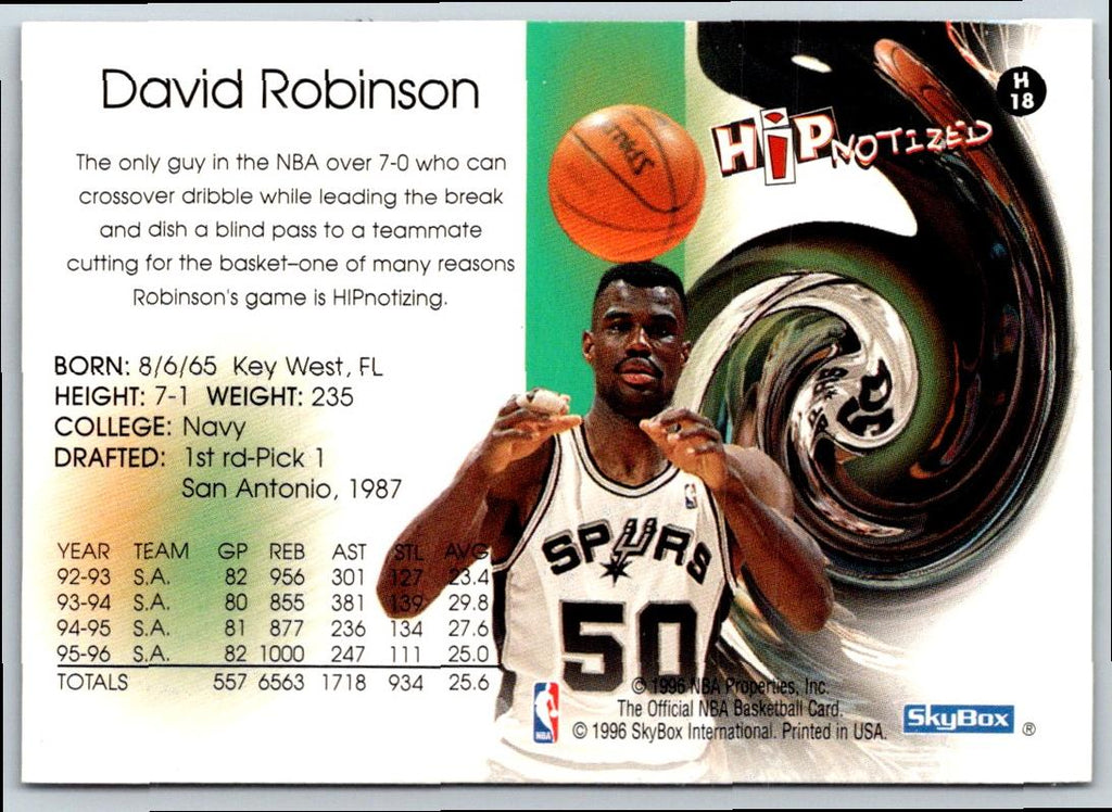 This 1996 SkyBox Premium Intimidators David Robinson #18 San Antonio Spurs card is a must-have for any San Antonio Spurs fan and basketball card collector. Show your team spirit and add to your collection with this quality card featuring one of the most iconic basketball players of all time. The card has impressive graphics on the front and back and is sure to be a prized part of any collection. A great way to show your admiration for the Spurs and David Robinson!