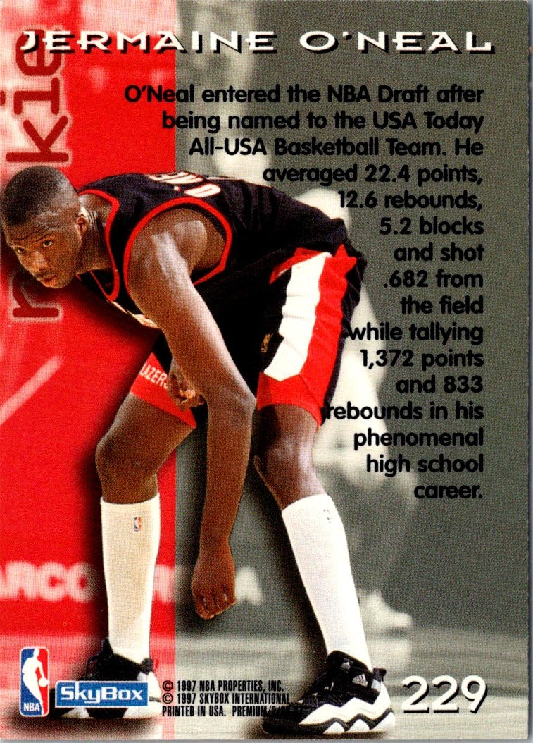 This 1996 SkyBox Premium Jermaine O'Neal #229 Portland Trail Blazers card is a must-have for any O'Neal or Trail Blazers fan. Featuring a crisp image of O'Neal in his Trail Blazers uniform, this card is sure to be a conversation piece. The back of the card has O'Neal's vital stats, as well as a summary of his 1995-1996 season accomplishments. Collectors will appreciate the quality and detail of the card, which is sure to become a valuable collectible. Add it to your collection today!