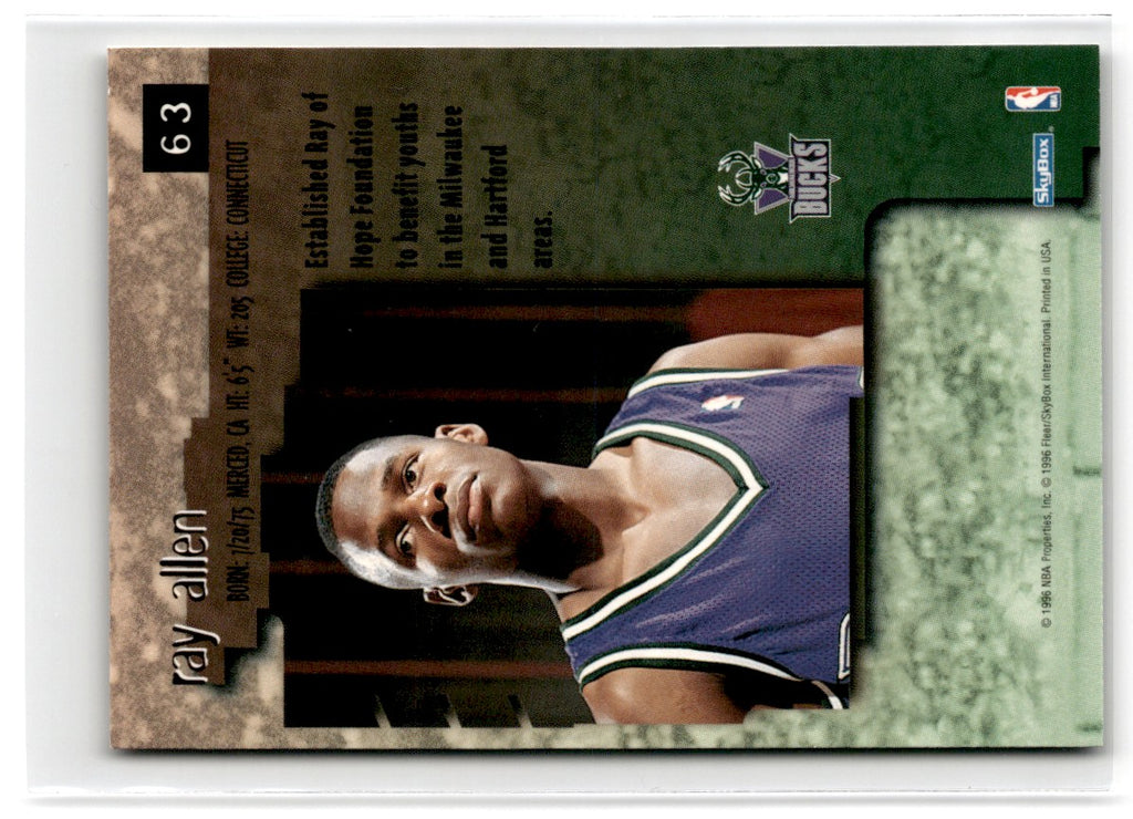 This 1996 SkyBox Premium Ray Allen #63 Milwaukee Bucks card is a must-have for any basketball collector. Featuring a classic black-and-white photo of Ray Allen on the court, this card is a great way to show your appreciation for the legendary player. The card is in excellent condition, with rich colors and crisp edges. A perfect addition to any collection!